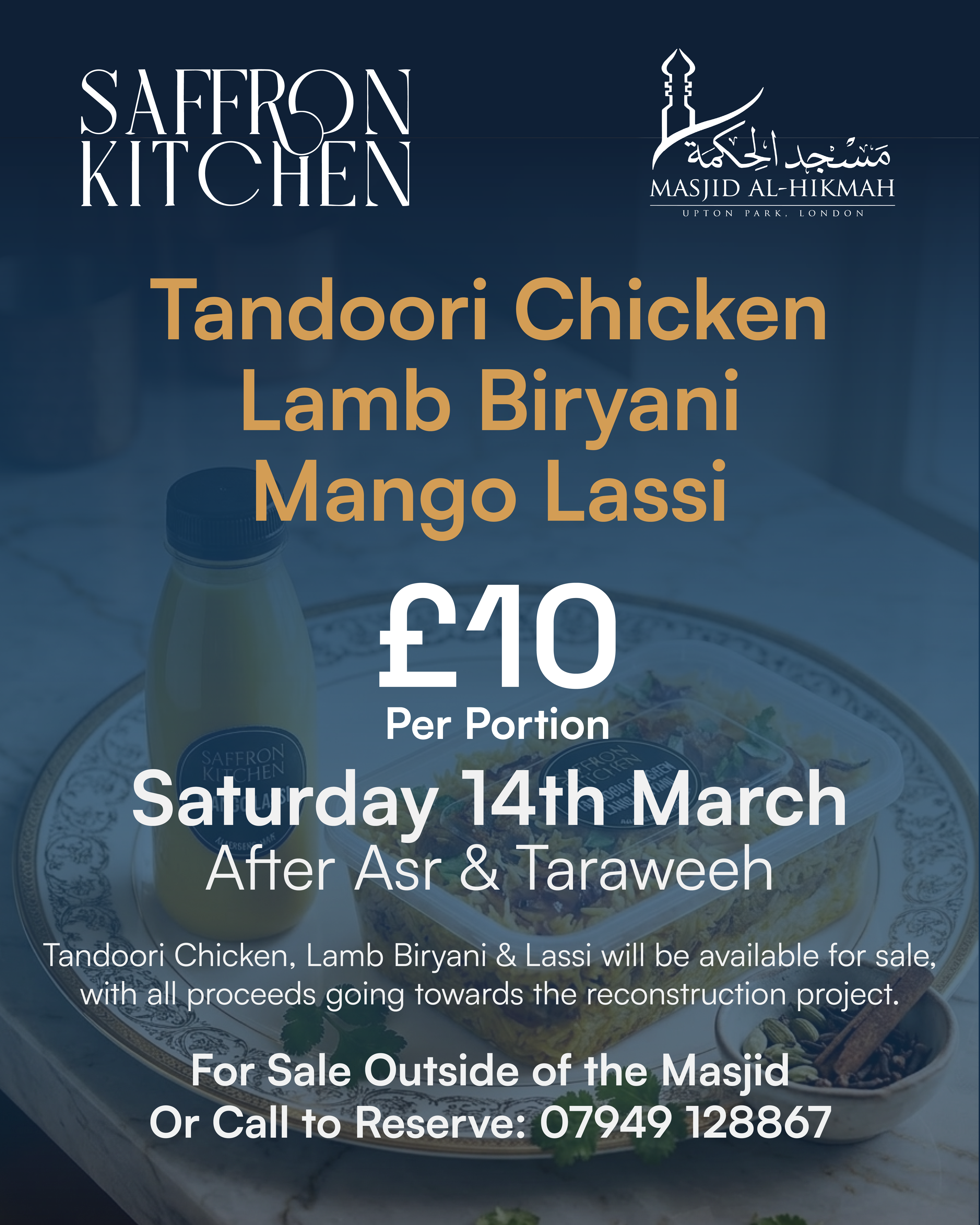 Tandoori Chicken, Lamb Biryani & Lassi will be available for sale, with all proceeds going towards the reconstruction project.
