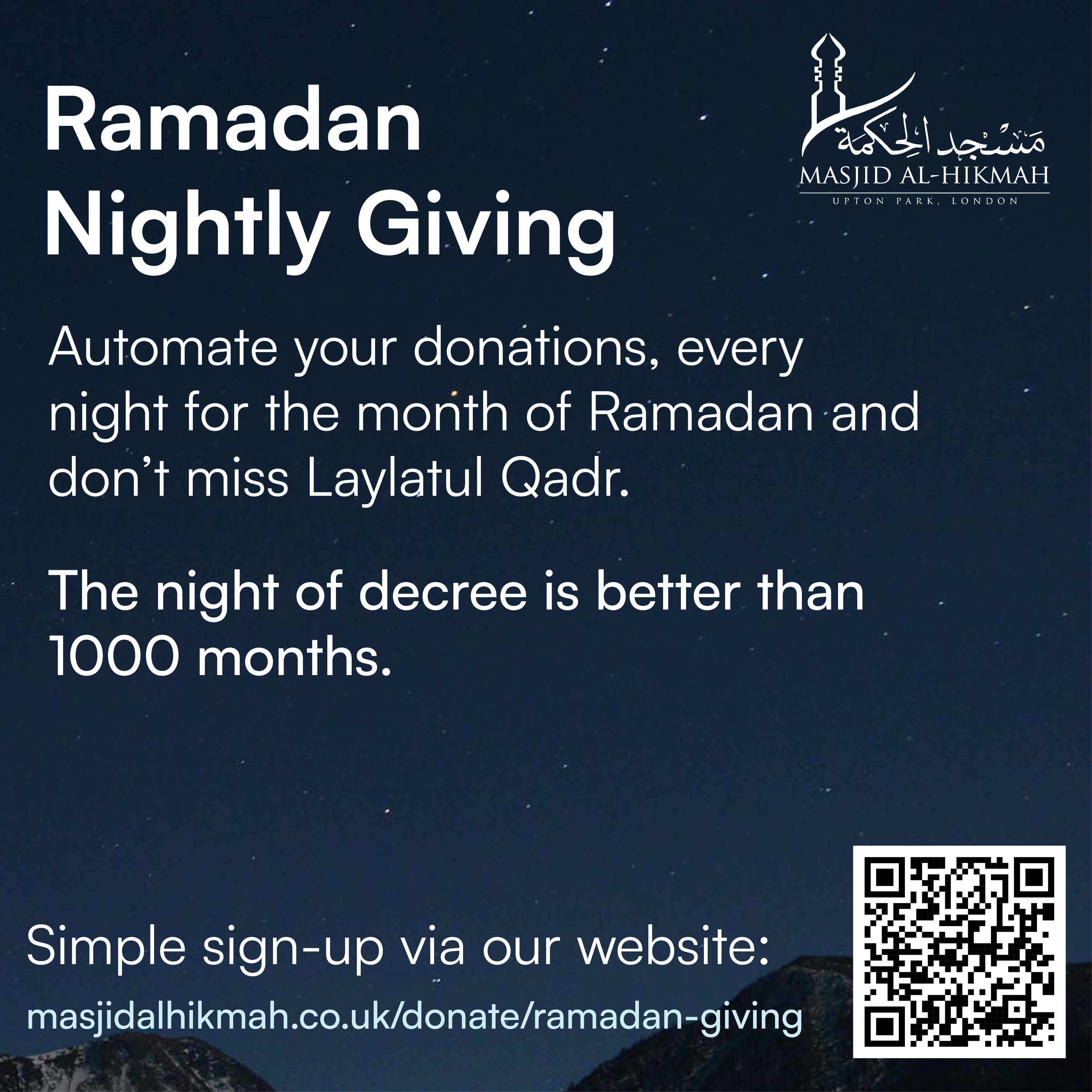 18 February 2026 Automated Giving Throughout Ramadan Donate automatically every night. Laylatul Qadr awaits. https://masjidalhikmah.co.uk/donate/ramadan-giving
